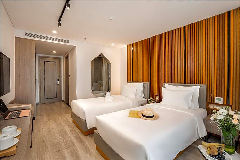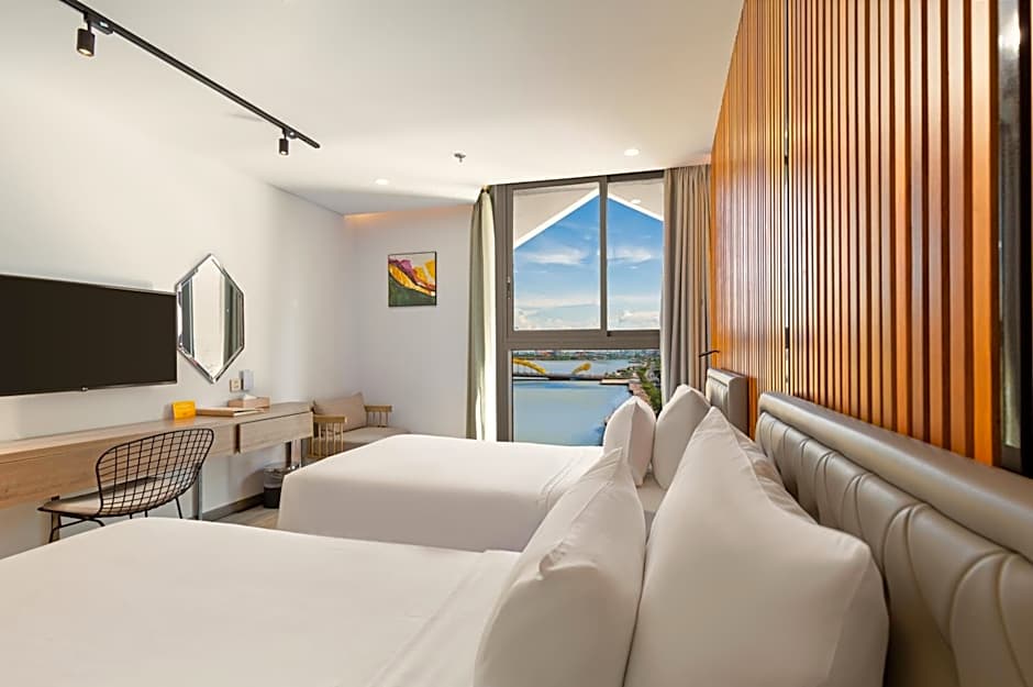 This room is 89 ft², featuring a tiny balcony looking to Han River, Dragon Bridge and a part of city. It includes two single beds (3.6 ft x 6.6 ft each), a spacious bathtub, and comes fully equipped with an iron and ironing board in every room.